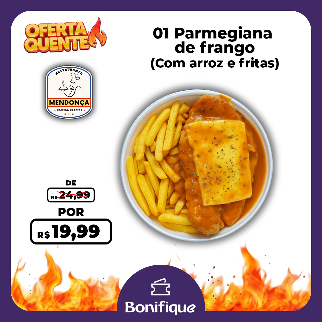 Um delicioso Parmegiana de Frango do Restaurante Mendonça por Apenas R$ 19,99. Você pode retirar ou comer no local.